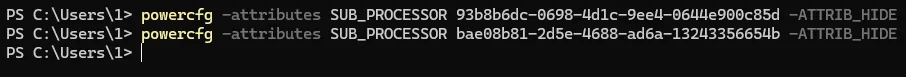 powercfg -attributes SUB_PROCESSOR bae08b81-2d5e-4688-ad6a-13243356654b -ATTRIB_HIDE