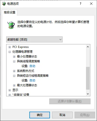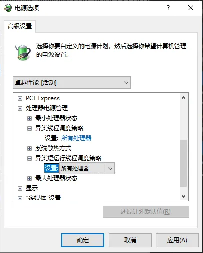 - 将 异类线程调度策略 和 异类短运行线程调度策略 选项修改为 所有处理器,然后点击确定即可。