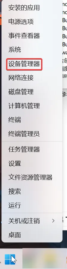 右击开始按钮,选择设备管理器打开。